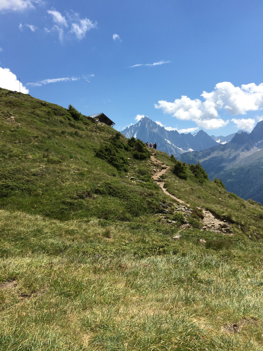 We reached the pass at Le Brevent at about 7,500 feet. We could see into another mountain range beyond, mountains as far as the eye could see. There was a rock pile to one side of the pass, and our trail continued up the side of another mountain towards the peak. We rested for a while and then carried on.