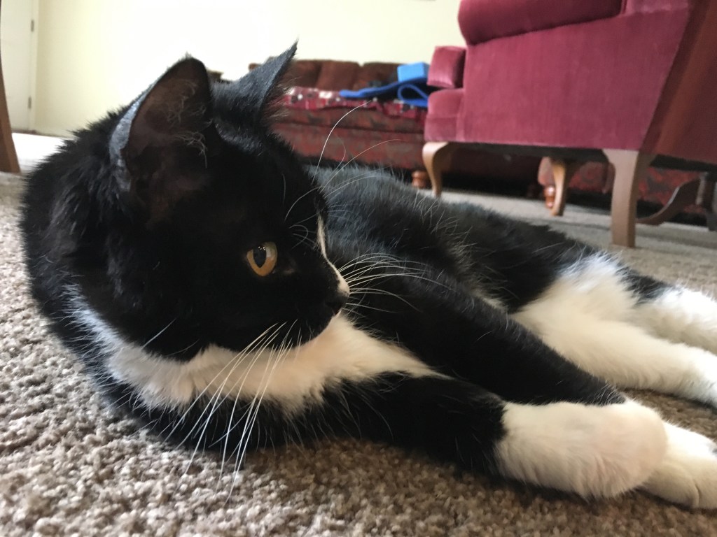 My cat Tidbit is 16, the equivalent of 84 in people years. She’s a tuxedo cat, with fluffy black and white fur. Her back legs and front paws are white and the color stops so precisely that she looks like she’s been dipped in paint. She has white all the way from her chin down her stomach. She has one dab of black on the third toe of her left paw, and the pad underneath that pad is black, while all the other pads are pink. She sports an irregular white stripe down her nose, and her nostrils are half pink and half black. She has surprising, bright gold eyes.