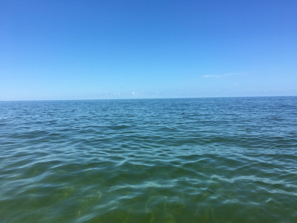 As we spent more time in the Gulf, I learned its moods. Some days the water stretched out softly like a great blue blanket, its surface broken only by an occasional dolphin or turtle. On these days, you could see below the surface to the grass and sand beneath on Seahorse Reef. Sometimes we saw jellyfish floating by on tides. Other times we saw fish swimming between grassy patches. On other days, the wind would create white-tipped swells and the water would turn gray and opaque.