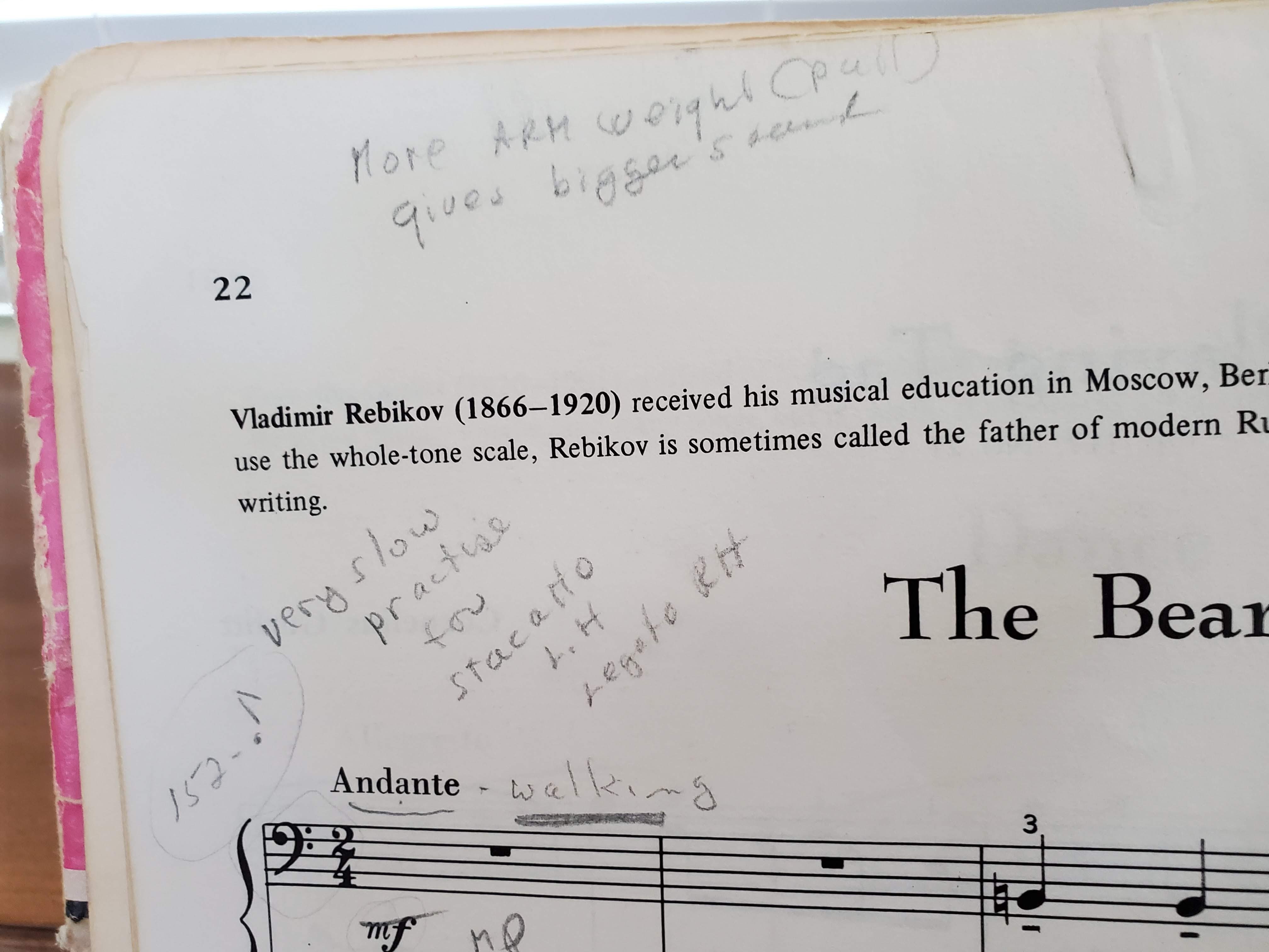 I recently bought a used piano after almost 15 years piano-free. I managed to dig out several of my old, yellowing piano books, which have followed me from my childhood in Washington state to Arkansas to Florida and finally to California. And when I opened them, my piano teacher’s handwriting transported me back more than 40 years to a two-story blue Victorian house sitting atop a hillside in a small rural town in the late 1970s.
