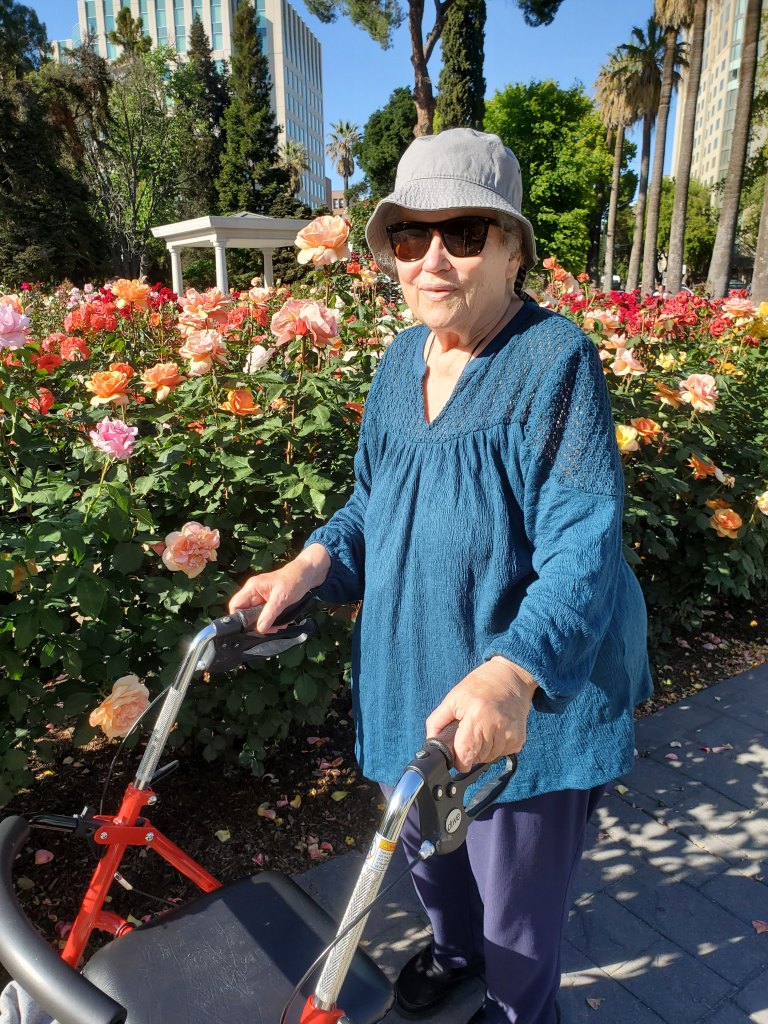 I took some photos of my mom there, smelling the roses, resting on her walker, sitting with me on a bench.