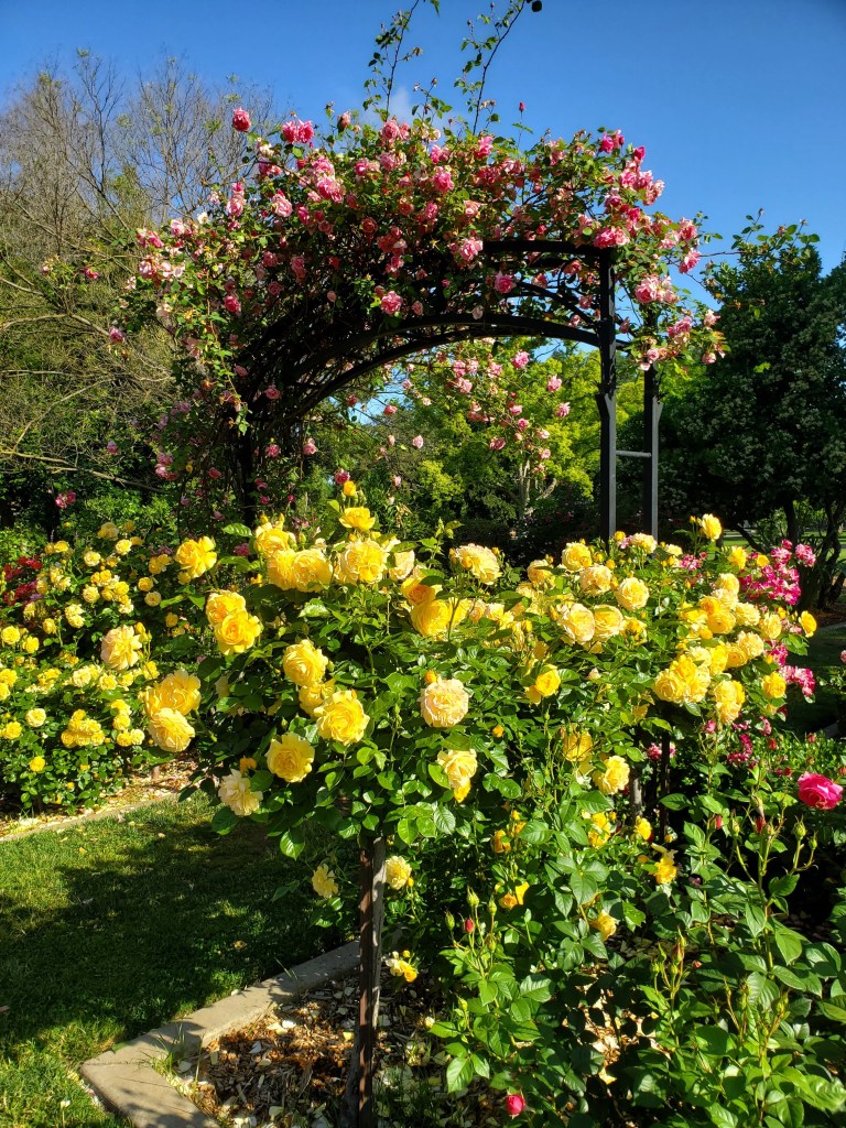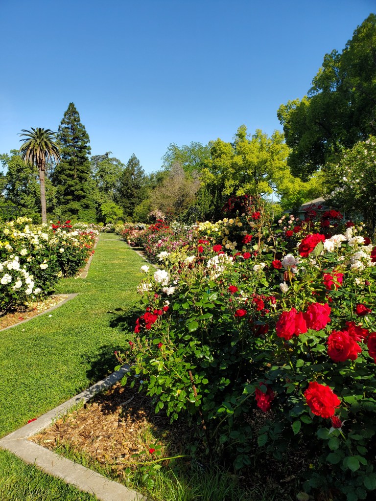 This year, I drove by McKinley Park in East Sacramento around the anniversary of her death, just before Mother’s Day. The splashes of color beckoned. I stopped and parked the car. I walked slowly through the roses, making my way around the labyrinth. I soaked in the colors. I inhaled the heady scents. I took in the beauty not only of the tight rosebuds waiting to bloom, but also the browning edges of roses past their prime and the petals falling to the ground, signaling the impermanence of all things.