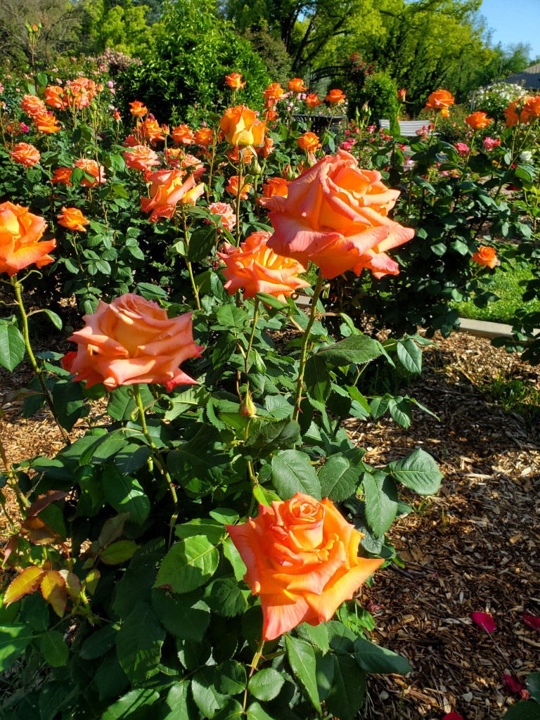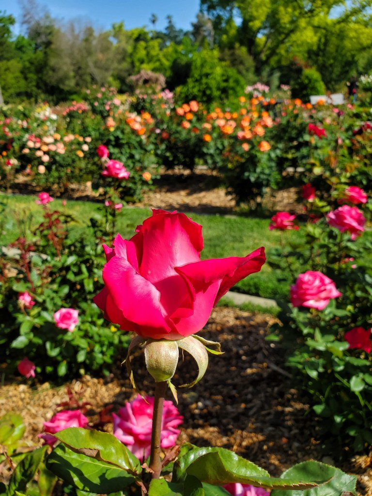 A riot of color greeted us. Reds, pinks, purples, oranges, yellows and whites in every direction. We stopped a moment to catch our breath, then Mom led the way to the first rose bush.