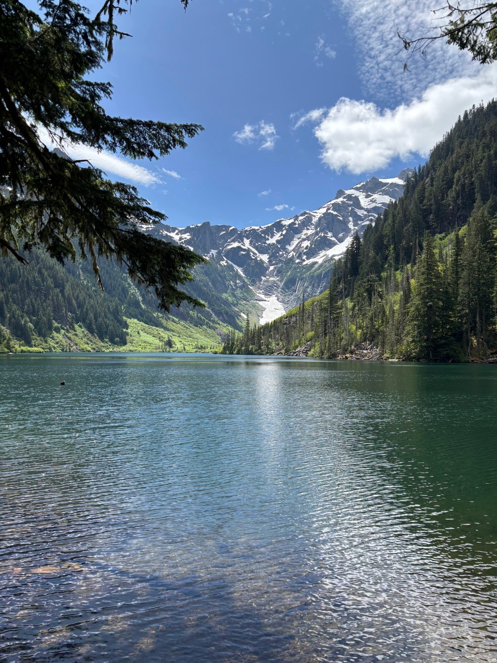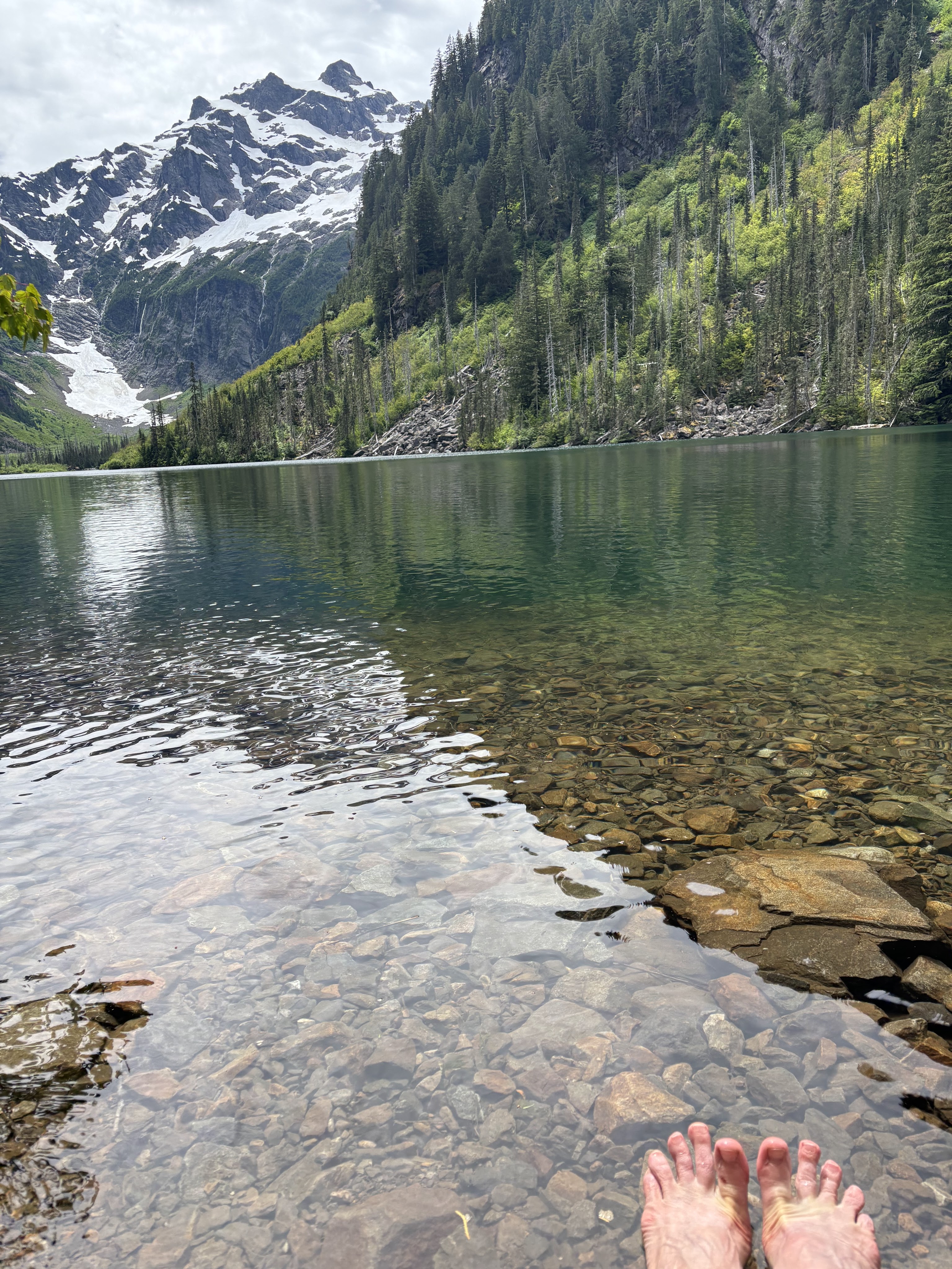 Exactly five months after I fractured my foot, I hiked 11 miles to a lake in the North Cascades. I soaked in the sounds of Elliott Creek cascading in small falls and pools down the mountainside. I breathed in the loamy scent of cedar and fir. I drank in the deer ferns lining the trail. I found a tree to lounge against at the lake as I lunched. I admired the lake’s azure beauty and the reflection of snow-capped peaks beyond.