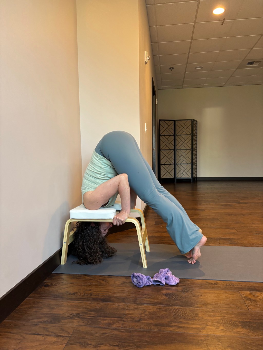 I told Janet, the studio owner where I teach at Yoga in the Center, that I was practicing drills to learn headstand. She snuck me opportunities to practice in classes.