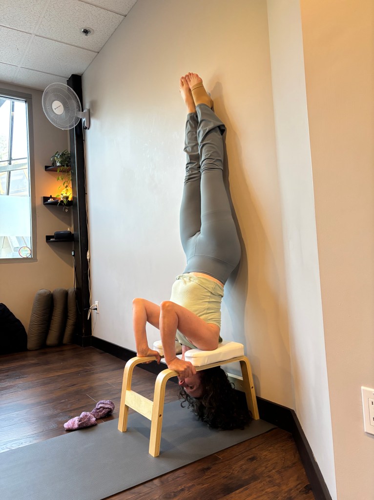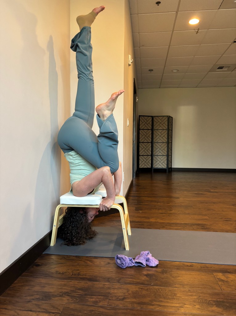 In training, I learned to do many things that I never thought possible, such as bakasana, or crow pose, an arm balance where you rest your knees on the backs of your triceps and lift your body up. I also let go of the idea that headstand was out of reach. I decided in January of 2025 to work on getting my feet up over my head.